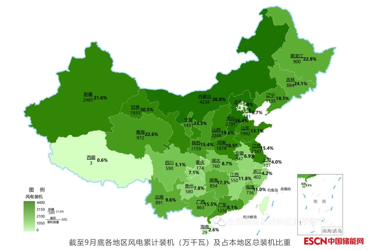 截至9月底,全國風(fēng)電累計(jì)裝機(jī)3.48億千瓦,同比增加17%。三季度,全國風(fēng)電新增裝機(jī)533.9萬千瓦,同比增加0.72%。新增裝機(jī)規(guī)模較大的省區(qū)主要有河北137萬千瓦、蒙西60萬千瓦、陜西49萬千瓦、廣東49萬千瓦。風(fēng)電新增裝機(jī)以陸上風(fēng)電為主,陸上風(fēng)電新增裝機(jī)477.4萬千瓦,占全國風(fēng)電新增裝機(jī)比重達(dá)到89.4%。海上風(fēng)電新增裝機(jī)56.5萬千瓦,主要布局在廣東、浙江地區(qū)。