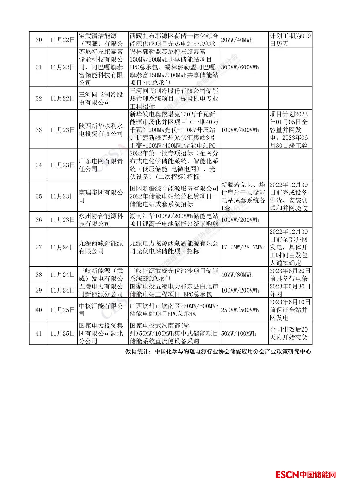 中國儲能網(wǎng)訊:據(jù)中國儲能網(wǎng)不完全統(tǒng)計(jì),11月發(fā)布41個儲能招標(biāo)項(xiàng)目,其中百兆級項(xiàng)目22個,吉瓦級項(xiàng)目2個,產(chǎn)品采購及其他項(xiàng)目17個。招標(biāo)內(nèi)容包括EPC、儲能系統(tǒng)設(shè)備采購、工程設(shè)計(jì)、建設(shè)施工/監(jiān)理等,總規(guī)模超3.87GW/8.37GWh。