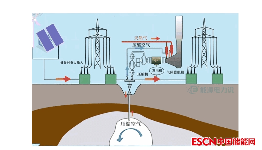 當(dāng)電力過剩時(shí),將空氣壓縮儲(chǔ)存到地下儲(chǔ)氣洞穴里(洞穴可以是鹽穴、報(bào)廢礦井、儲(chǔ)氣罐、山洞、過期油氣井、新建儲(chǔ)氣井等),將電能轉(zhuǎn)化為壓縮空氣勢(shì)能。當(dāng)需要用電時(shí),高壓空氣經(jīng)過加熱,進(jìn)入膨脹機(jī),變成常壓的空氣,在此過程中帶動(dòng)發(fā)電機(jī)發(fā)電,空氣壓縮勢(shì)能轉(zhuǎn)化成電能輸出。