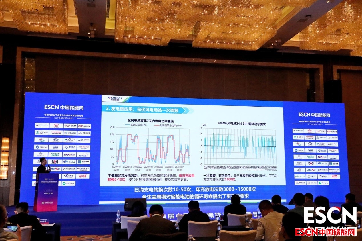 介紹完我司的系列產(chǎn)品,接下來介紹我司產(chǎn)品在各種領(lǐng)域的應(yīng)用。第一個是在發(fā)電側(cè)新能源場站的一次調(diào)頻。新能源的快速發(fā)展給電網(wǎng)業(yè)帶來了一個極大的挑戰(zhàn),各地也陸續(xù)出臺政策,要求新能源具備一次調(diào)頻功能,與此同時,各種標(biāo)準(zhǔn)陸續(xù)地出臺。新能源廠站的調(diào)頻功率需求是分鐘級、MW級,需求配置大功率的儲能,即我們的虛擬同步發(fā)電技術(shù)(VSG)。現(xiàn)階段存在的問題是,單一形式的儲能是無法解決功率密度和能量密度的矛盾。行業(yè)上現(xiàn)在比較常見的做法,就是用這種混合型儲能,比如說鉛酸電池加超級電容器,或者磷酸電池加飛能的混合形式,這種混合儲能也面臨著一個問題,配置比例以及協(xié)調(diào)控制的難度較大;另外隨著光伏子陣和風(fēng)力發(fā)電機(jī)的單機(jī)的規(guī)模也不斷增大的,對于這種高成本的功率型儲能配比和能量型全生命周期的循環(huán)壽命,也是提出了一個更高的要求。這對混合型儲能經(jīng)濟(jì)性和性價比也是一個非常大的考驗。