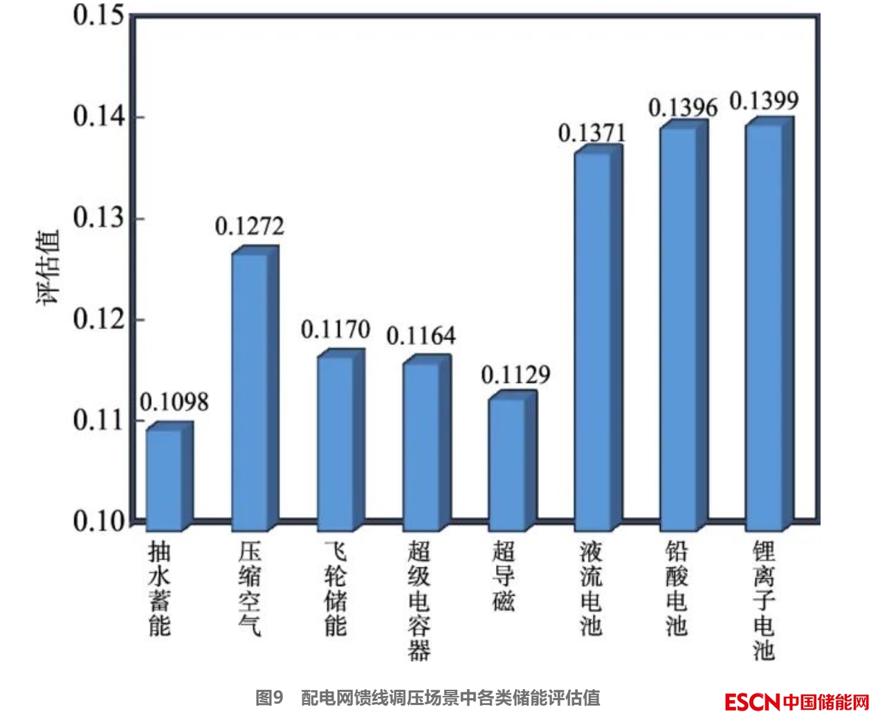 配電網(wǎng)饋線調(diào)壓場景下各類儲能評估值如圖9所示。由圖9可知鋰離子電池評估值最高,為0.139 9,其次鉛酸電池、液流電池、壓縮空氣儲能和飛輪儲能評估值分別為0.139 6、0.137 1、0.127 2和0.117 0,權(quán)重占比較低的方案為超級電容器和超導(dǎo)磁儲能,評估值分別為0.116 4和0.112 9,抽水蓄能評估值最低,為0.109 8。