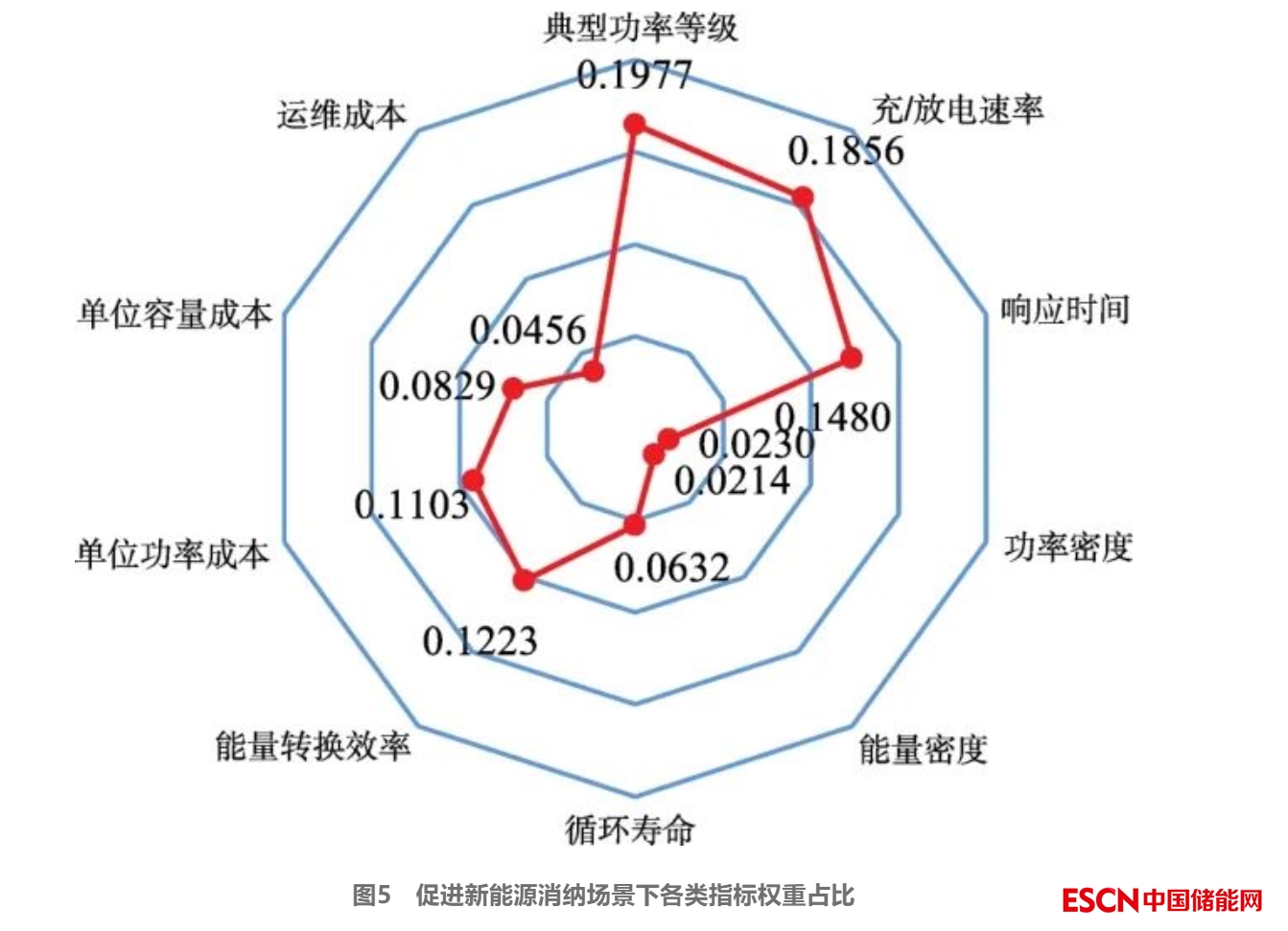 從表6可知,在10個指標(biāo)中典型功率等級權(quán)重占比最高,為0.197 7,其次充/放電速率、響應(yīng)時間及能量轉(zhuǎn)換效率的權(quán)重占比分別為0.185 6、0.148 0及0.122 3,單位功率成本、單位功率成本、循環(huán)壽命及運(yùn)維成本分別為0.110 3、0.082 9、0.063 2及0.045 6,功率密度、能量密度權(quán)重占比較低,分別為0.023 0和0.021 4。各指標(biāo)權(quán)重占比如圖5所示,典型功率等級的權(quán)重與系統(tǒng)規(guī)模相關(guān),而充/放電速率和響應(yīng)時間指標(biāo)則和新能源滲透率相關(guān)。