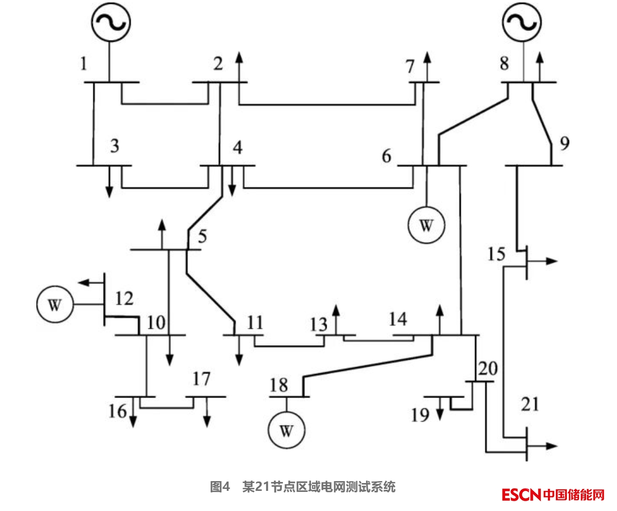 以圖4所示區(qū)域電網(wǎng)為算例進(jìn)行驗(yàn)證,該系統(tǒng)最大負(fù)荷為410 MW,通過節(jié)點(diǎn)1和8與外部大電網(wǎng)相連,風(fēng)電機(jī)組接入節(jié)點(diǎn)6、節(jié)點(diǎn)12、節(jié)點(diǎn)18,假設(shè)系統(tǒng)風(fēng)機(jī)發(fā)電滲透率為50%,風(fēng)機(jī)容量共205 MW。風(fēng)電等間歇性的可再生能源發(fā)電接入電網(wǎng)易發(fā)生潮流雙向流動的現(xiàn)象,給新能源消納帶來挑戰(zhàn),并影響電網(wǎng)調(diào)壓,造成電網(wǎng)運(yùn)行指標(biāo)的下降。