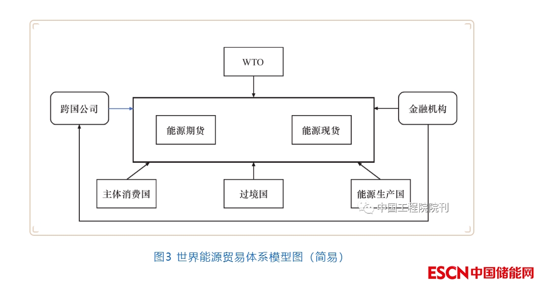 能源作為一類商品在世界范圍內(nèi)流通和貿(mào)易,從市場觀點(diǎn)出發(fā)進(jìn)行能源問題分析具有重要價(jià)值。能源在市場中的主要形式有能源商品的現(xiàn)貨貿(mào)易、期貨貿(mào)易和能源技術(shù)的合作共享。世界能源貿(mào)易體系由能源生產(chǎn)國、過境國和主體消費(fèi)國構(gòu)成,國際組織如世界貿(mào)易組織(WTO),架構(gòu)在上層進(jìn)行統(tǒng)一指導(dǎo)和協(xié)調(diào)(見圖3)。與此同時(shí),金融機(jī)構(gòu)作為金融市場的重要參與者和中介服務(wù)機(jī)構(gòu)參與到能源貿(mào)易中;部分跨國公司由于自身業(yè)務(wù)涉及全球多個(gè)地區(qū)的市場,在國際貿(mào)易中能夠提供增值服務(wù)或具備參與優(yōu)勢,也會(huì)參與到能源貿(mào)易中。以WTO為代表的國際組織作為最上層的能源貿(mào)易協(xié)調(diào)和管理體系,對(duì)整個(gè)貿(mào)易條款的簽訂、貿(mào)易的實(shí)施環(huán)節(jié)進(jìn)行管控。