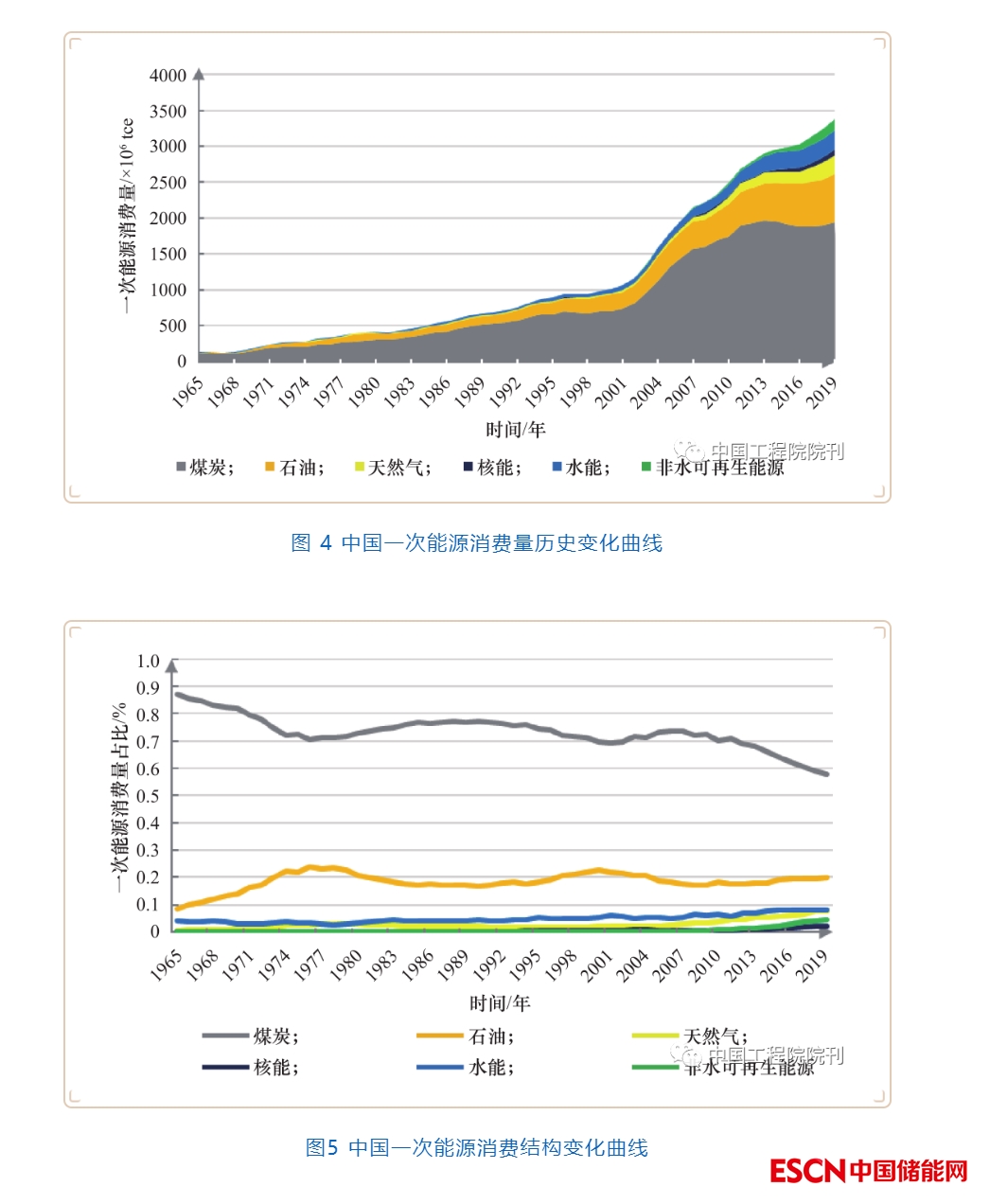 1965—2019年,一次能源消費(fèi)量(見圖4)及消費(fèi)結(jié)構(gòu)(見圖5)的變化情況顯示:我國一次能源消費(fèi)量從1.87×108 tce 增長到4.83×108 tce,年均增長率為6.25%;而能源相關(guān)CO2 排放量則從4.89×108 t 增加到9.83×109 t,年均增長率為5.74%;在此期間,煤炭始終占據(jù)能源主力位置,但占比從87.0% 下降至57.4%。