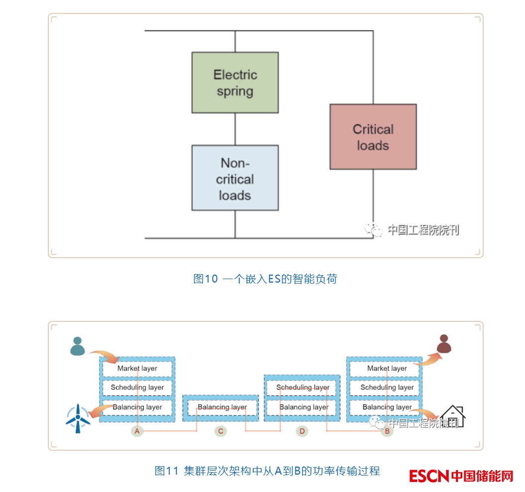 (3)平衡層。計(jì)劃層能確保集群在調(diào)度時(shí)間步長(zhǎng)(幾秒鐘或者更短時(shí)間)內(nèi)維持凈功率平衡。為了維持凈功率平衡,需要消除由于集群內(nèi)發(fā)電或負(fù)荷波動(dòng)造成的與計(jì)劃功率平衡的偏差。研究人員為外圍集群發(fā)明了電力彈簧(electric spring, ES),它沒(méi)有用于輸電系統(tǒng)同步發(fā)電機(jī)的調(diào)速器和勵(lì)磁系統(tǒng)。ES是一種電力電子設(shè)備,它利用普遍存在于外圍集群中的負(fù)荷來(lái)消除功率偏差。由于某些負(fù)荷(如熱水器、空調(diào)和非必要的照明等)能夠承受短暫的功率降低或增加,而且自身無(wú)明顯不良影響,可以將這些負(fù)荷認(rèn)為是非重要負(fù)荷。ES與非重要負(fù)荷以串聯(lián)或者嵌入的方式組合連接,并將該組合與其他負(fù)荷(重要負(fù)荷)并聯(lián)連接,如圖10所示。當(dāng)出現(xiàn)供電盈余或者不足時(shí),ES將暫時(shí)的功率不平衡量轉(zhuǎn)移給非重要負(fù)荷,通過(guò)讓非重要負(fù)荷消耗更多或者更少的功率來(lái)消除集群內(nèi)的功率不平衡。嵌入ES的智能負(fù)荷可以被視為一個(gè)高級(jí)的需求響應(yīng)系統(tǒng)。