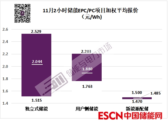 11月,儲能EPC/PC中標(biāo)共涉及獨立式儲能項目、用戶側(cè)儲能項目和新能源配儲能三種場景,全部為2小時儲能系統(tǒng),加權(quán)平均報價為1.976元/Wh。