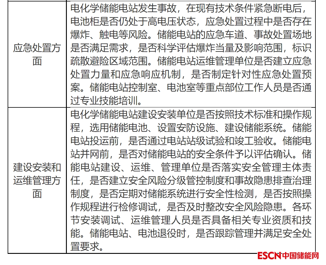 電池本身安全風(fēng)險(xiǎn)隱患、電池管理系統(tǒng)安全風(fēng)險(xiǎn)隱患、儲(chǔ)能系統(tǒng)安全風(fēng)險(xiǎn)隱患、儲(chǔ)能場(chǎng)所安全風(fēng)險(xiǎn)隱患、安防設(shè)施風(fēng)險(xiǎn)隱患、應(yīng)急處置風(fēng)險(xiǎn)隱患、建設(shè)安裝和運(yùn)維管理風(fēng)險(xiǎn)隱患等。(詳見檢查評(píng)估細(xì)則)