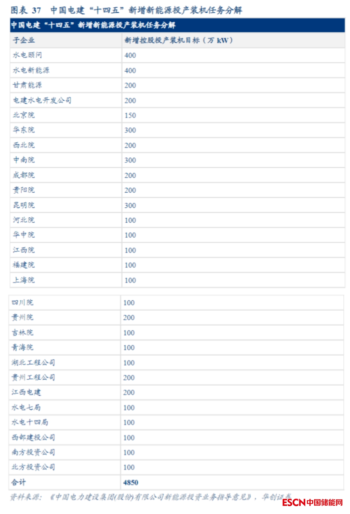 2021年初,根據(jù)中國電建印發(fā)《中國電力建設集團(股份)有限公司新能源投資業(yè)務指導意見》,公司預計將于“十四五”期間在境內外新增控股投產(chǎn)風光電裝機容量3000萬千瓦。根據(jù)文件對下屬28個企業(yè)分解的新能源投產(chǎn)裝機任務來看,合計的新增規(guī)模將達4850萬千瓦。這是中國電建首次明確大力發(fā)展新能源投資運營業(yè)務,進一步放寬集團下屬企業(yè)新能源項目投資主體范圍。