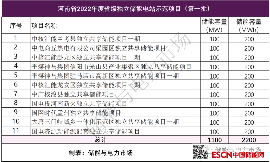 2022年11月15日,河南省發(fā)改委發(fā)布了《河南省2022年度省級(jí)獨(dú)立儲(chǔ)能電站示范項(xiàng)目(第一批)名單》,共計(jì)11個(gè)儲(chǔ)能項(xiàng)目入選,儲(chǔ)能總?cè)萘?.1GW/2.2GWh。11個(gè)項(xiàng)目清單如下: