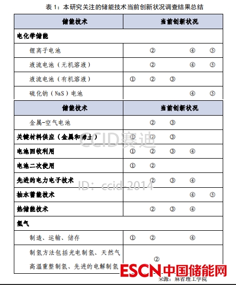 能源相關(guān)的技術(shù)創(chuàng)新通常需要經(jīng)過五個(gè)階段:①概念提出;②技術(shù)研發(fā);③一定規(guī)模的工程試驗(yàn);④技術(shù)示范;⑤部署應(yīng)用。表1涵蓋了各種儲能技術(shù)當(dāng)前創(chuàng)新階段。隨著脫碳要求變得更為嚴(yán)格和對波動性可再生能源發(fā)電的依賴不斷增加,長時(shí)儲能技術(shù)具有更廣泛的應(yīng)用前景。例如在波動性可再生能源發(fā)電供應(yīng)低谷期或由于極端天氣導(dǎo)致異常高水平的電力需求,而此時(shí)電網(wǎng)運(yùn)營商被禁止使用未裝碳捕集裝置的天然氣發(fā)電時(shí),長時(shí)儲能技術(shù)至關(guān)重要。