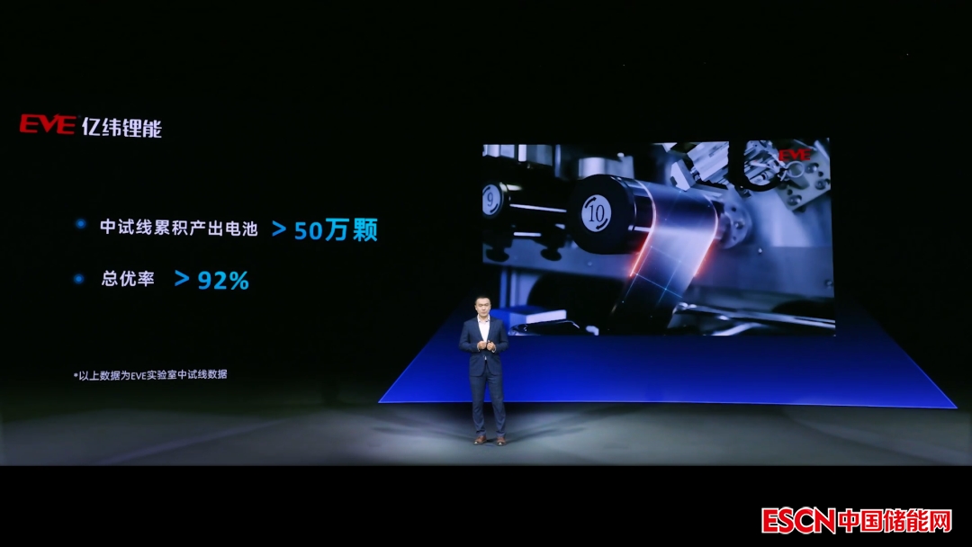 動力電池研究院圓柱電池研究所所長徐悅斌,發(fā)布新一代大圓柱電池的研發(fā)樣品:能量密度350Wh/kg,可實現(xiàn)9分鐘超快充。在電池性能再創(chuàng)新高的同時,由億緯鋰能自主研發(fā)的大圓柱中試線,已累計制樣超50萬顆,整體優(yōu)率達(dá)到92%。