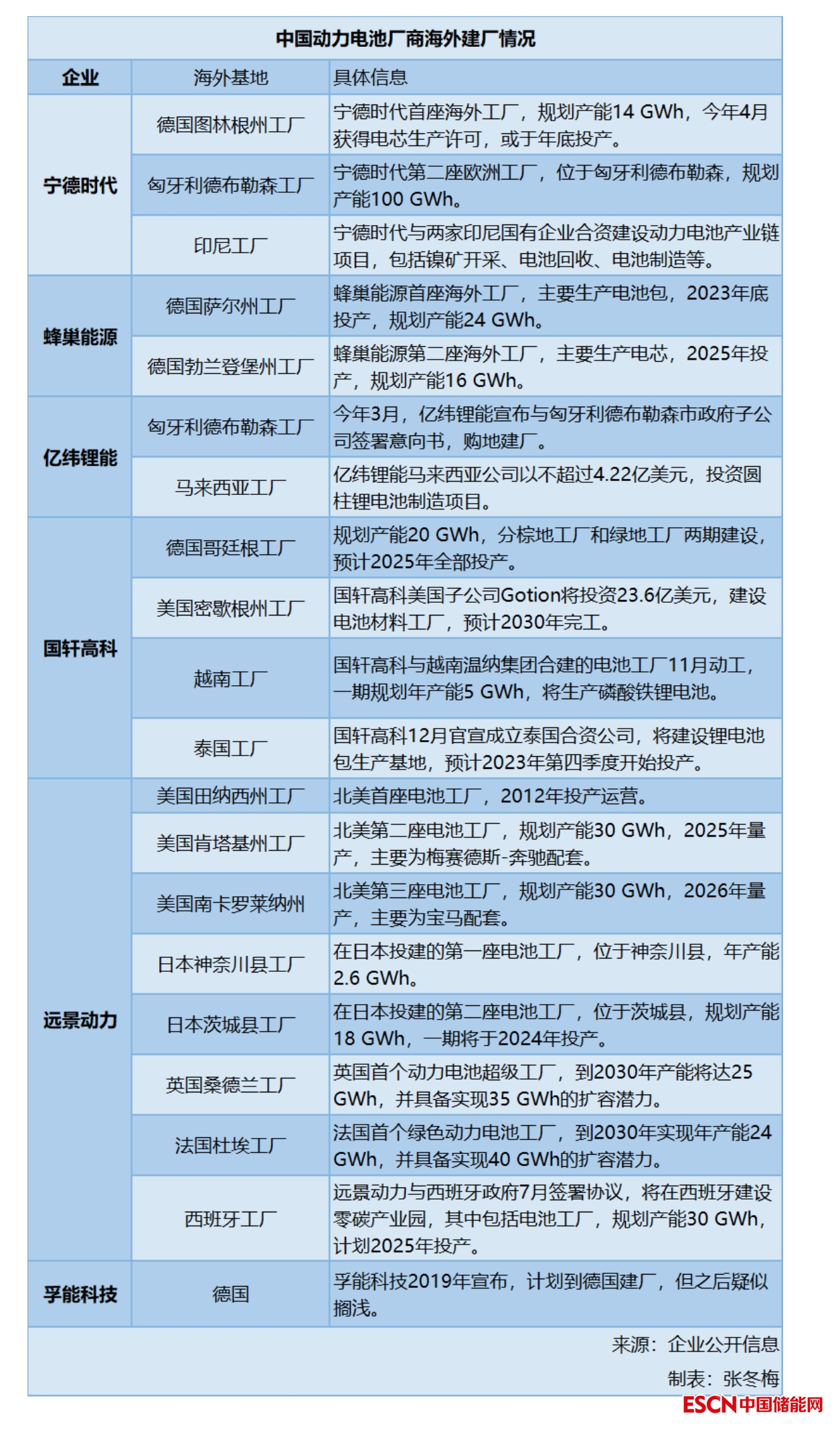 國軒高科12月15日官宣泰國合資公司,11月越南工廠開建,10月赴美建廠,6月舉行德國工廠揭牌儀式。遠景動力3月宣布在美國肯塔基州建設電池工廠,7月宣布在西班牙布局電池工廠,10月官宣南卡羅萊納州建廠計劃。寧德時代4月投建印尼電池產(chǎn)業(yè)鏈項目,8月官宣匈牙利建廠計劃。