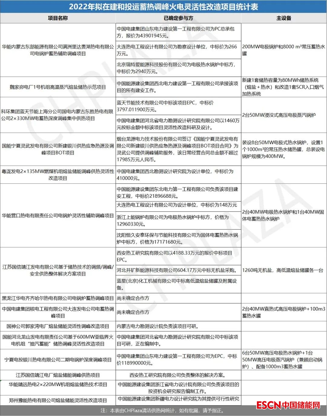 蓄熱調(diào)峰技術(shù)方案作為其中的一種主要技術(shù)路線,對于提高電力系統(tǒng)的可再生能源消納能力和防治大氣污染具有十分重要的意義。CHPlaza清潔供熱平臺統(tǒng)計(jì)了2022年在建/投運(yùn)的蓄熱調(diào)峰火電靈活性改造相關(guān)項(xiàng)目如下,以供參考。