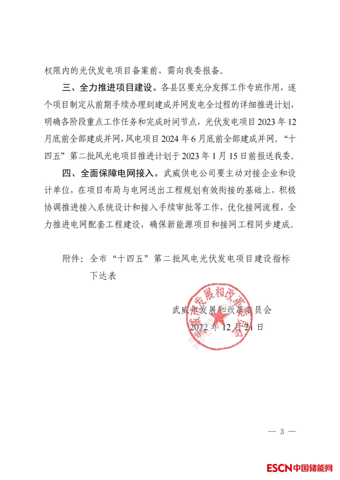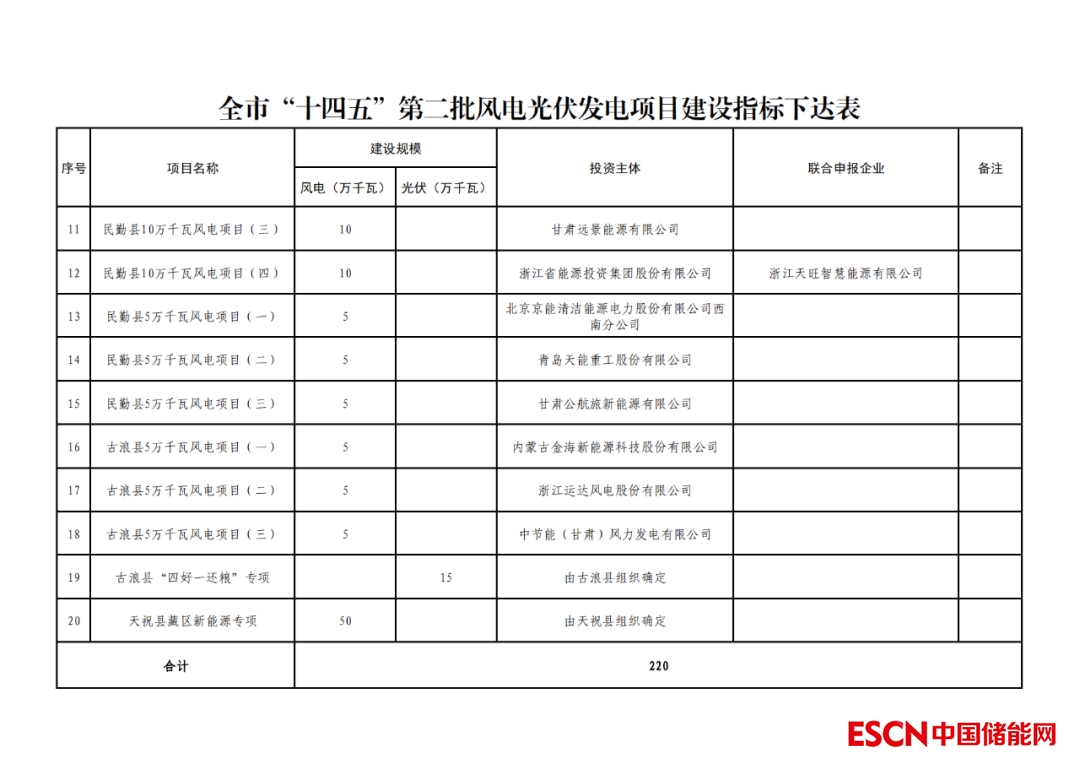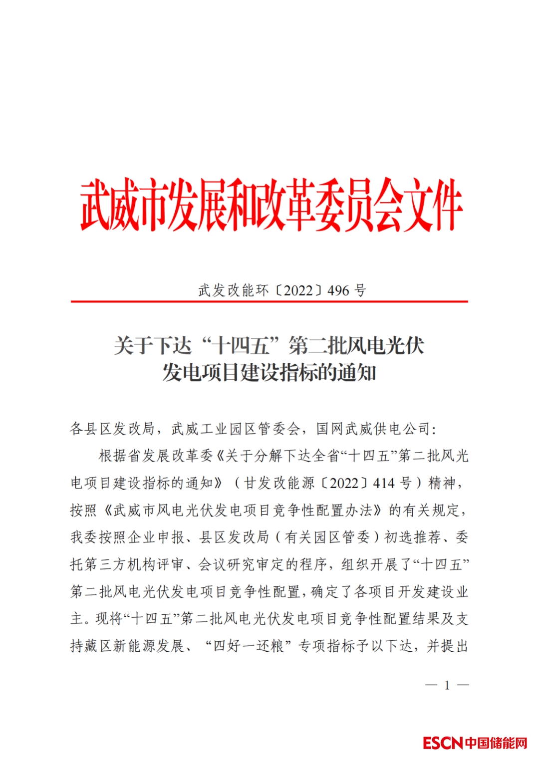 中國儲能網(wǎng)訊:12月21日,甘肅省武威市發(fā)改委發(fā)布《關(guān)于下達(dá)“十四五”第二批風(fēng)電光伏發(fā)電項(xiàng)目建設(shè)指標(biāo)的通知》。
