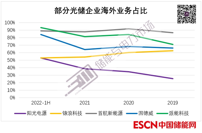 以派能、錦浪、固德威等為代表的傳統(tǒng)深耕戶用儲能和分布式光伏逆變器的企業(yè)自然當(dāng)仁不讓,紛紛抓住借道戶用儲能電池和逆變器的機(jī)會實(shí)現(xiàn)新的業(yè)績增長,其海外業(yè)務(wù)占比已經(jīng)超過80%。