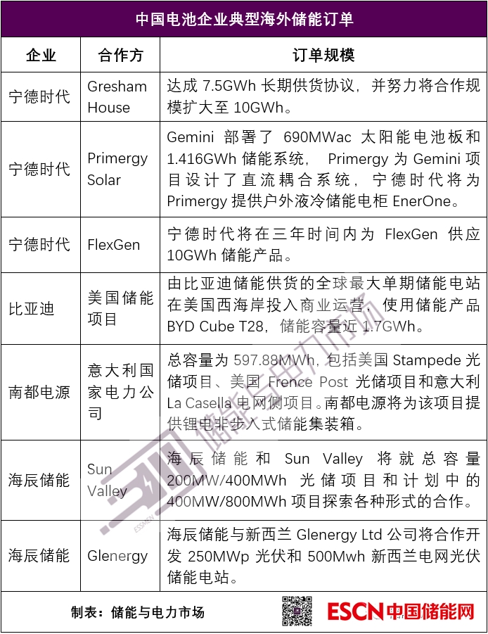 寧德時代無疑成為國內(nèi)電池企業(yè)海外簽單的大戶。根據(jù)儲能與電力市場的追蹤,僅已公布的FlexGen、Broad Reach Power、Primergy Solar、Gresham House等幾個客戶的項目采購和長期訂單就超過22GWh。此外,比亞迪、海辰、國軒高科、南都電源、雙一力等企業(yè)也在美國、澳大利亞、新西蘭等市場多有斬獲,并且有多個訂單規(guī)模都超過了500MWh。