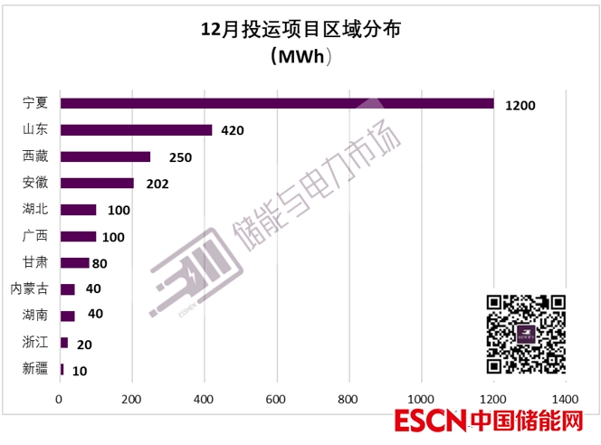 從項目地域分布上看,寧夏并網(wǎng)規(guī)模最大,為1200MWh,山東次之,西藏位居第三。