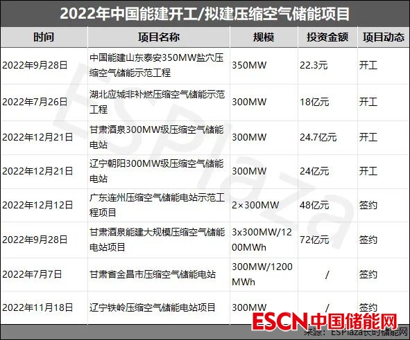 2022年以來,中國能建已開工的壓縮空氣儲能項(xiàng)目共計(jì)1250MW,擬建項(xiàng)目共計(jì)2100MW,完成了50余座壓縮空氣儲能電站的選點(diǎn)布局工作。中國能建計(jì)劃首批在全國范圍內(nèi)布局100座壓縮空氣儲能電站。
