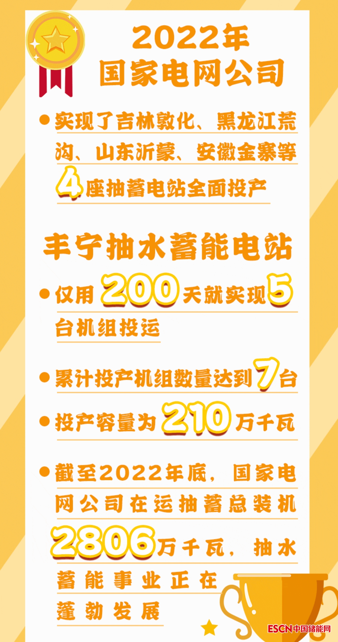 2022年,國(guó)家電網(wǎng)公司實(shí)現(xiàn)了吉林敦化、黑龍江荒溝、山東沂蒙、安徽金寨等4座抽蓄電站全面投產(chǎn)。此外,豐寧抽水蓄能電站僅用200天就實(shí)現(xiàn)5臺(tái)機(jī)組投運(yùn),累計(jì)投產(chǎn)機(jī)組數(shù)量達(dá)到7臺(tái),投產(chǎn)容量為210萬千瓦。