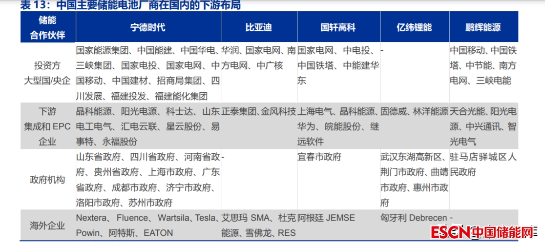 國(guó)內(nèi)市場(chǎng),中國(guó)儲(chǔ)能電池廠商正積極加快儲(chǔ)能下游布局。圍繞儲(chǔ)能產(chǎn)業(yè)鏈下游,以寧 德為首的儲(chǔ)能電芯廠商 19 年開始打造產(chǎn)業(yè)鏈閉環(huán),紛紛與政府、大型國(guó)企央企、產(chǎn)業(yè)鏈下 游和海外企業(yè)牢牢綁定,并開始延伸系統(tǒng)集成和項(xiàng)目開發(fā)。我們認(rèn)為,隨著中國(guó)電力儲(chǔ)能 發(fā)展路線日漸清晰,具備下游合作資源的儲(chǔ)能電芯廠商有望在產(chǎn)業(yè)鏈合作中發(fā)揮更大價(jià)值。