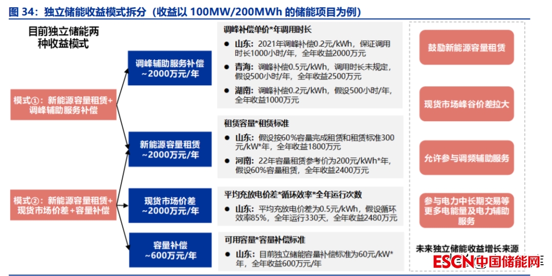 目前中國(guó)獨(dú)立儲(chǔ)能收益模式主要分為兩種。在電力現(xiàn)貨市場(chǎng)未建立地區(qū),青海、寧夏 和湖南等多個(gè)省市出臺(tái)了獨(dú)立儲(chǔ)能電站調(diào)峰補(bǔ)償標(biāo)準(zhǔn)。獨(dú)立儲(chǔ)能收益模式以調(diào)峰補(bǔ)償+容量 租賃為主。在山東等建立電力現(xiàn)貨市場(chǎng)的地區(qū),獨(dú)立儲(chǔ)能收益模式以現(xiàn)貨市場(chǎng)套利+容量租賃+容量補(bǔ)償為主。以 100MW/200MWh 的獨(dú)立儲(chǔ)能為例,目前獨(dú)立儲(chǔ)能兩種商業(yè)模式下, 穩(wěn)定的可預(yù)期收益每年可達(dá)到 4000 萬(wàn)元以上。