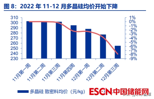 硅料產(chǎn)能釋放打開光伏裝機(jī)彈性。2022 年光伏終端需求增長(zhǎng)旺盛,國(guó)內(nèi)多晶硅現(xiàn)貨價(jià) 從年初的24萬(wàn)元/噸漲至8 月的超30萬(wàn)元/噸,預(yù)計(jì)2022年國(guó)內(nèi)多晶硅供應(yīng)量為92萬(wàn)噸, 可支撐交流側(cè)裝機(jī)240-250GW,下游地面電站的裝機(jī)增長(zhǎng)仍受制于硅料供應(yīng)瓶頸和價(jià)格。 2023 年將迎硅料產(chǎn)能釋放大年,結(jié)合 Solarzoom 相關(guān)統(tǒng)計(jì),全球硅料名義產(chǎn)能將從 22 年底的 128 萬(wàn)噸增長(zhǎng)至 23 年底的 240 萬(wàn)噸,預(yù)計(jì) 23 年多晶硅全球供應(yīng)量約為 147 萬(wàn) 噸,可支撐超 400GW 的交流側(cè)裝機(jī)。23 年起硅料新增產(chǎn)能開始批量釋放,對(duì)應(yīng)硅料價(jià)格 開啟下行通道,也為對(duì)組價(jià)價(jià)格敏感度較高的集中式電站項(xiàng)目的建設(shè)帶來(lái)了彈性。
