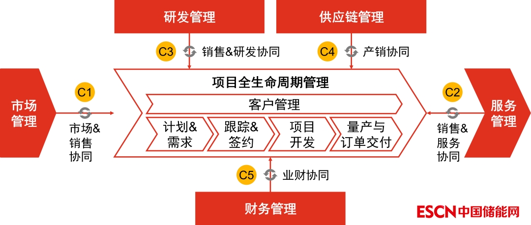1個重點,圍繞項目進行全生命周期管理;5個協(xié)同分別為:市場和銷售的協(xié)同,銷售和服務的協(xié)同,銷售和研發(fā)的協(xié)同,產(chǎn)銷協(xié)同,業(yè)務和財務的協(xié)同。