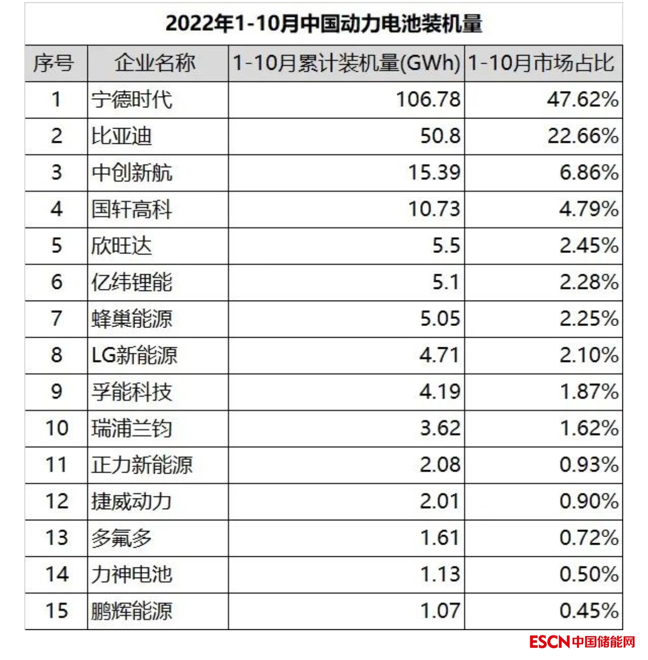 2022年1-10月,我國(guó)動(dòng)力電池裝機(jī)量224.2GWh,同比增長(zhǎng)108.7%。其中三元電池裝機(jī)量88.0GWh,占總裝機(jī)量39.2%,同比增長(zhǎng)62.8%;磷酸鐵鋰電池裝機(jī)量136.0GWh,占總裝機(jī)量60.6%,同比增長(zhǎng)155.6%,呈現(xiàn)快速增長(zhǎng)發(fā)展勢(shì)頭。1-10月,我國(guó)新能源汽車市場(chǎng)共計(jì)51家動(dòng)力電池企業(yè)實(shí)現(xiàn)裝機(jī)配套,較去年同期減少3家,排名前10家動(dòng)力電池企業(yè)裝機(jī)量211.9GWh,占總裝機(jī)量94.5%。
