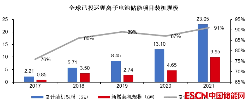 根據(jù)儲能系統(tǒng)使用電池的不同,電化學(xué)儲能可細(xì)分為鉛蓄電池、鈉硫電池、鋰離子電池、液流電池等類別。在已投運(yùn)的新型儲能項(xiàng)目中,鋰離子電池繼續(xù)占據(jù)絕對主導(dǎo)地位。數(shù)據(jù)顯示,2017-2021年,鋰離子電池儲能累計(jì)裝機(jī)規(guī)模從 2.2GW 迅速上漲至 23GW,年復(fù)合增長率高達(dá) 79.65%。