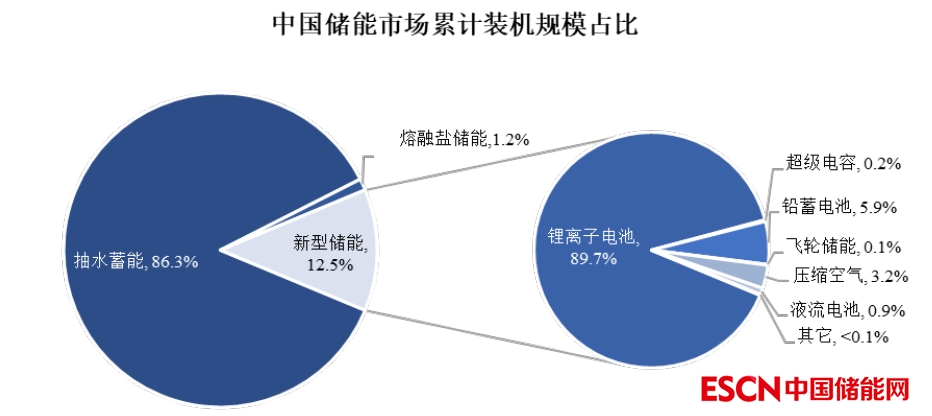 根據(jù)儲能原理的不同,儲能技術(shù)可以細(xì)分為機(jī)械儲能、電磁儲能和電化學(xué)儲能等三大類。截至 2021 年末,在全球累計(jì)儲能裝機(jī)規(guī)模中,86.2%為抽水蓄能;在中國累計(jì)儲能裝機(jī)規(guī)模中,86.3%為抽水蓄能。