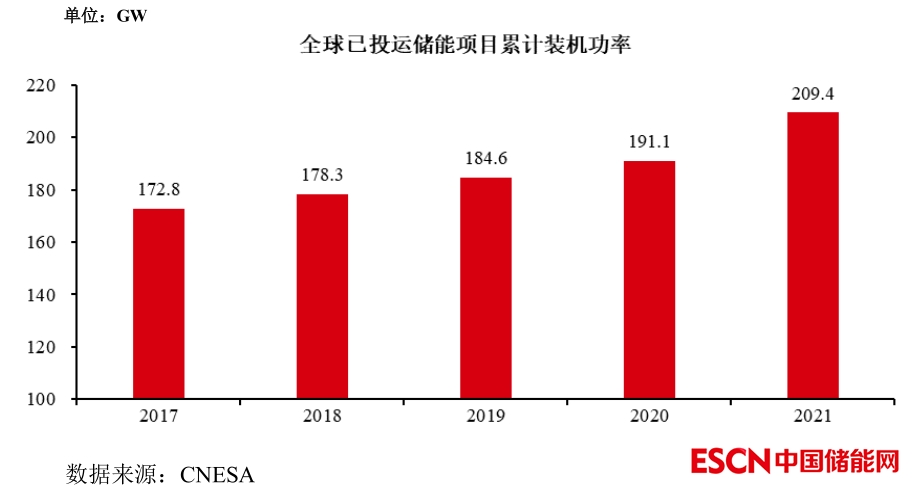 最新數(shù)據(jù)顯示,截至 2021 年末,全球已投運(yùn)儲能項(xiàng)目累計(jì)裝機(jī)功率達(dá)到 209.4GW,較 2020 年末 191.1GW 同比增長約 9.6%。其中,新型儲能的累計(jì)裝機(jī)規(guī)模為 25.4GW,同比增長 67.7%。