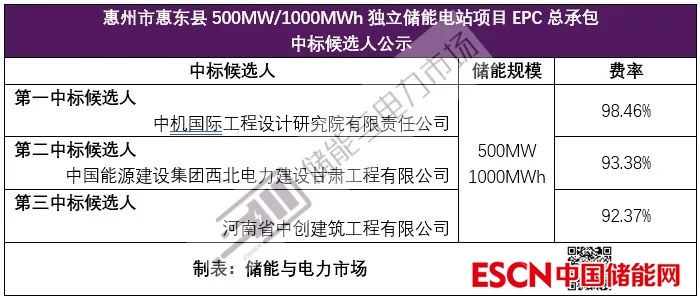近日,惠州市惠東縣500MW/1000MWh獨(dú)立儲能電站項目EPC總承包發(fā)布中標(biāo)人公示。中機(jī)國際工程設(shè)計研究院有限責(zé)任公司成為第一中標(biāo)候選人。中標(biāo)候選人如下。