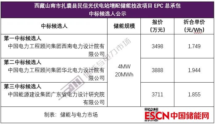 中國電力工程顧問集團西南電力設計院有限公司以總報價3498萬元,折合單價1.749元/Wh,成為第一中標候選人。第二、第三中標候選人報價分別為:1.944元/Wh,1.855元/Wh。