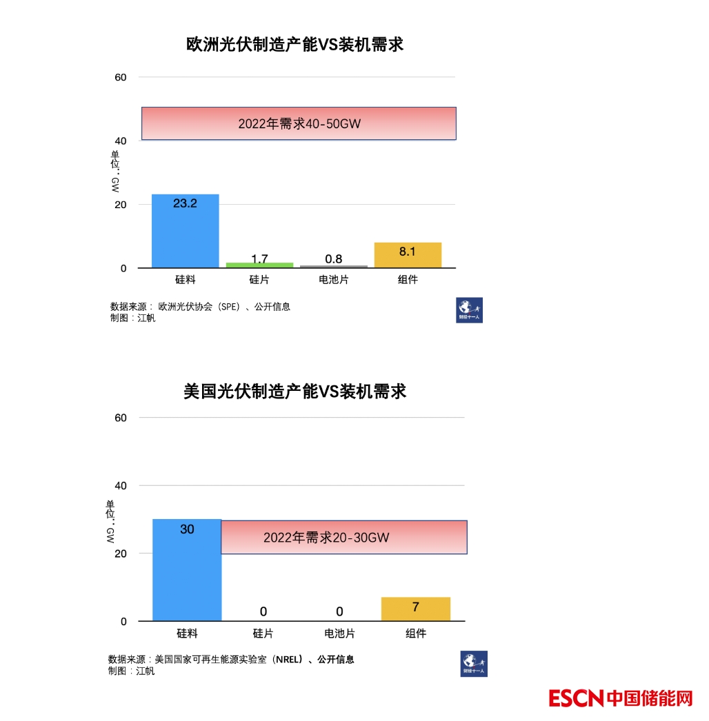 參照歐美2021年的實(shí)際裝機(jī)和裝機(jī)預(yù)期,其各自提出的本土制造能力目標(biāo)并不能完全匹配需求。也就是說(shuō),歐美尋求光伏制造能力一定程度的戰(zhàn)略自主,完全脫離中國(guó)光伏不現(xiàn)實(shí)。