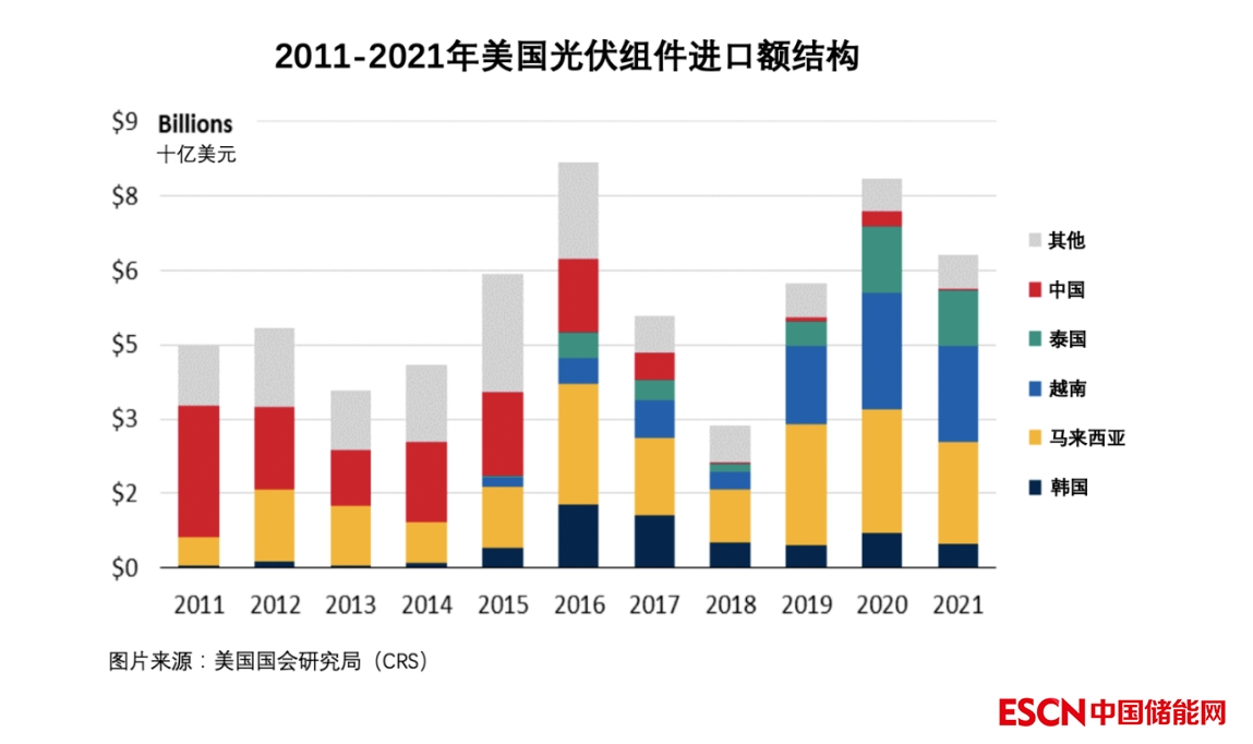 2011年—2020年,美國(guó)直接從中國(guó)進(jìn)口的光伏產(chǎn)品金額減少了86%。作為中國(guó)光伏企業(yè)海外產(chǎn)能主要集聚地的東南亞,眼下占據(jù)美國(guó)光伏組件八成以上份額。