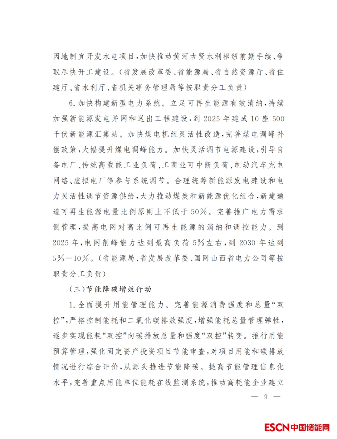 加快構(gòu)建新型電力系統(tǒng)。立足可再生能源有效消納,持續(xù)加強(qiáng)新能源發(fā)電并網(wǎng)和送出工程建設(shè),到2025年建成10座500千伏新能源匯集站。加快煤電機(jī)組靈活性改造,完善煤電調(diào)峰補(bǔ)償政策,大幅提升煤電調(diào)峰能力。加快靈活調(diào)節(jié)電源建設(shè),引導(dǎo)自備電廠、傳統(tǒng)高載能工業(yè)負(fù)荷、工商業(yè)可中斷負(fù)荷、電動(dòng)汽車充電網(wǎng)絡(luò)、虛擬電廠等參與系統(tǒng)調(diào)節(jié)。合理統(tǒng)籌新能源發(fā)電建設(shè)和電力靈活性調(diào)節(jié)資源供給,大力推動(dòng)煤炭和新能源優(yōu)化組合,新建通道可再生能源電量比例原則上不低于50%。完善推廣電力需求側(cè)管理,提高電網(wǎng)對(duì)高比例可再生能源的消納和調(diào)控能力。到2025年,電網(wǎng)削峰能力達(dá)到最高負(fù)荷5%左右,到2030年達(dá)到5%-10%。