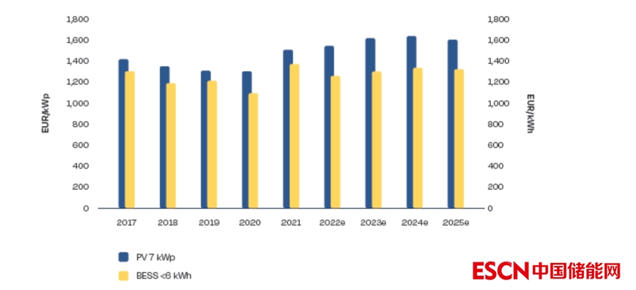 圖1.2 2017~2025年德國(guó)住宅太陽(yáng)能和住宅儲(chǔ)能系統(tǒng)成本發(fā)展趨勢(shì)