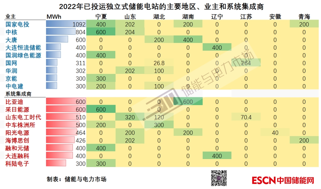 注:僅列舉并網(wǎng)規(guī)模不低于300MWh的業(yè)主和系統(tǒng)集成商;僅列舉規(guī)模前八位的區(qū)域。
