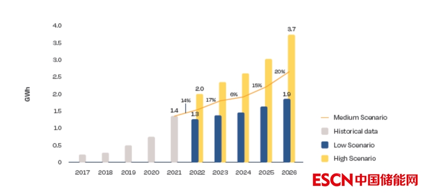 2020年,德國(guó)住宅電池儲(chǔ)能系統(tǒng)的溢價(jià)率迅速下降了70%以上,到2021年底降至0.0693歐元/kWh。出現(xiàn)這種情況,一方面是由于部署數(shù)量高,另一方面是由于2021年的平均電價(jià)為0.3214歐元/kWh。這為住宅太陽(yáng)能發(fā)電設(shè)施和電池儲(chǔ)能系統(tǒng)的應(yīng)用提供了具有吸引力的商業(yè)案例,并解釋了宅電池儲(chǔ)能系統(tǒng)81%的增長(zhǎng)率,盡管由于供應(yīng)鏈問題導(dǎo)致電池價(jià)格上漲。2022年的商業(yè)案例保持類似增長(zhǎng),只是零售電價(jià)在下半年超過了0.40歐元/kWh的水平,這使得住宅太陽(yáng)能發(fā)電設(shè)施和電池儲(chǔ)能系統(tǒng)的投資更具吸引力。到2022年,估計(jì)在“中等情景”下將達(dá)到1.5GWh,增長(zhǎng)了14%,如果獲得更多的電池以及安裝人員充足的話,這一數(shù)字將更高。