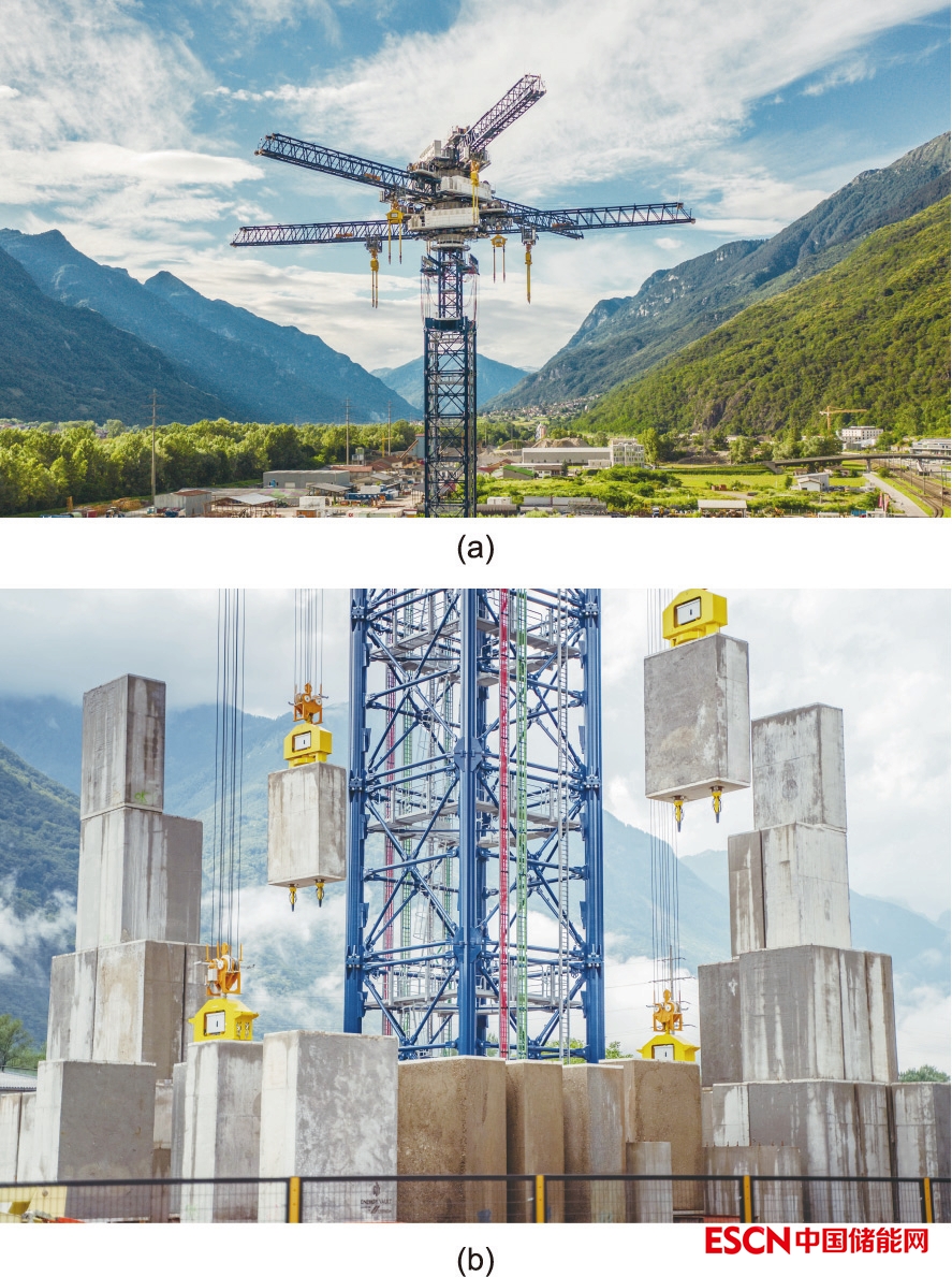 圖3. Energy Vault公司早期技術商業(yè)示范單元的頂部(a)和基座(b)。該技術通過起重機抬升或放下35 t的重物來儲存/釋放能量。該項目位于瑞士提契諾州,于2020年完工,并已連接至國家電網(wǎng)。該公司后來決定更換項目為圖1中的封閉式、模塊化設計。來源:Energy Vault(經(jīng)許可)。