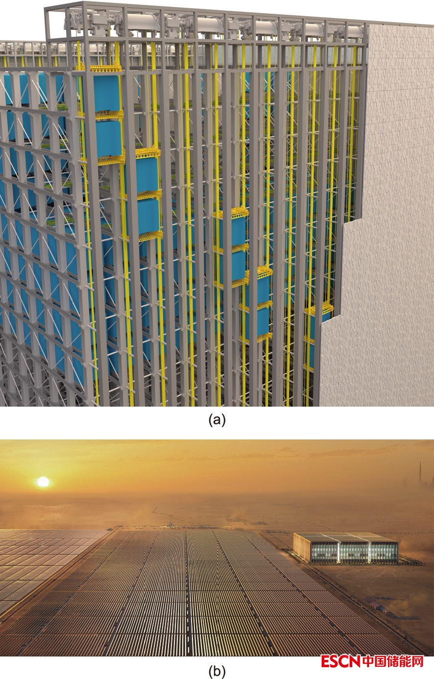 圖1. (a)Energy Vault公司的每“EVx”重力儲能模塊,每塊模塊預計儲存10 MW·h能量。設計EVRC需要至少4塊并排模塊,并且最高抬升至120 m高;在該維度下,儲存100 MW·h能量大概需要9713 m2土地。在每個“EVx”模塊結構中,大概有1300個30 t左右的重物(藍色)被放置在支架上。當“充電”時,這些重物被抬起(黃色)并在建筑高層儲存;放電時則相反。(b)太陽能發(fā)電站與相鄰的EVRC,該EVRC有9塊方形“EVx”模塊。在發(fā)電量高時,EVRC將通過重力勢能“穩(wěn)固并形成”復合發(fā)電設施的能源,并在日落后再轉化為電力。來源:Energy Vault(經(jīng)許可)。
