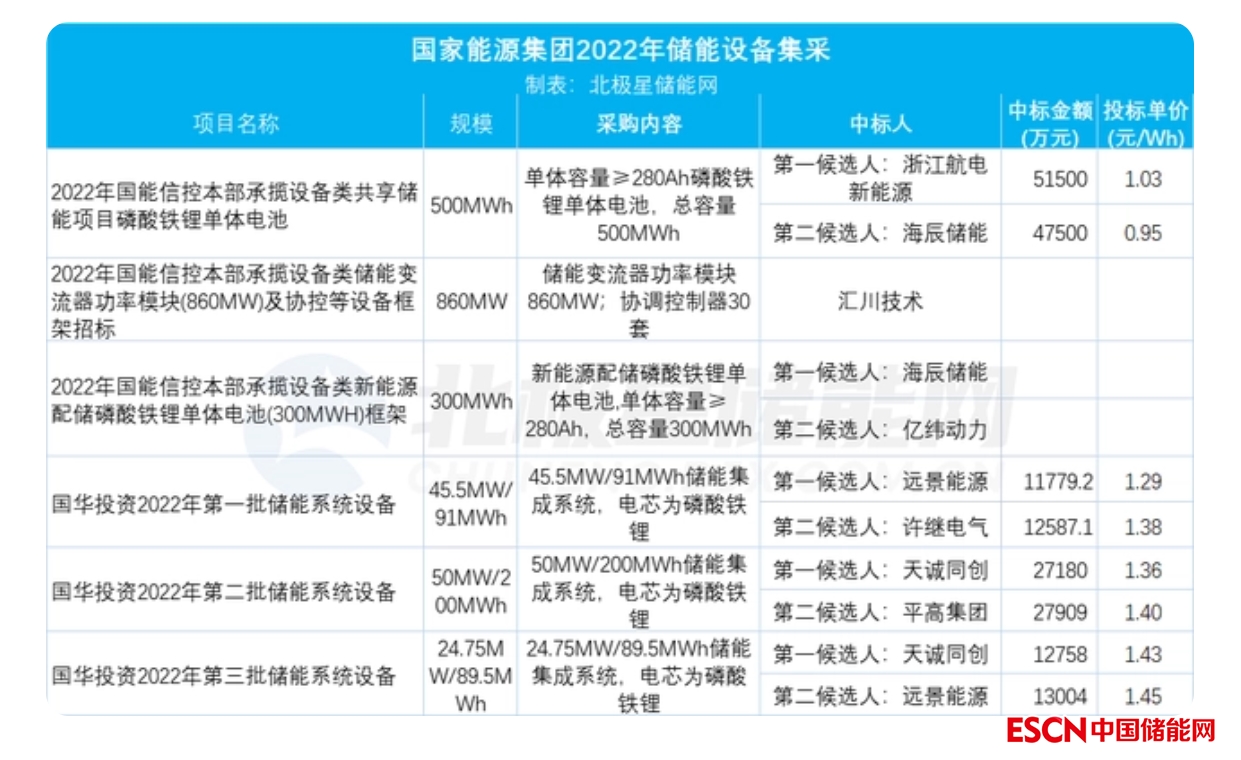 2022年以來(lái),國(guó)家能源集團(tuán)已開(kāi)標(biāo)多個(gè)儲(chǔ)能系統(tǒng)設(shè)備集采,總規(guī)模達(dá)1.18GWh。吸引海辰、平高、遠(yuǎn)景、許繼、天誠(chéng)同創(chuàng)等眾多有實(shí)力的企業(yè)參與競(jìng)標(biāo)。
