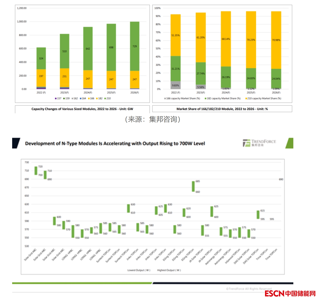 集邦咨詢的《N型技術(shù)發(fā)展趨勢(shì)展望》顯示,2023年大尺寸組件產(chǎn)能繼續(xù)擴(kuò)張,到今年年底,210尺寸組件產(chǎn)能占比達(dá)61.2%。從技術(shù)路線來看,2023年電池片產(chǎn)能擴(kuò)張以N型為主。N型時(shí)代已經(jīng)到來。隨著N型組件產(chǎn)品布局的加速,組件功率已然朝著700W邁進(jìn)。