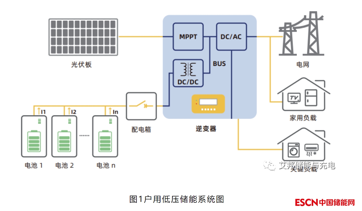 戶用低壓儲(chǔ)能系統(tǒng)是指電池電壓范圍40~60V的儲(chǔ)能系統(tǒng),由若干個(gè)電池并聯(lián)后連接到逆變器,經(jīng)逆變器內(nèi)部的隔離DC-DC,在母線處與光伏MPPT輸出的直流電交匯耦合,最終通過逆變輸出轉(zhuǎn)化為交流電并網(wǎng),部分逆變器具備有后備輸出功能。