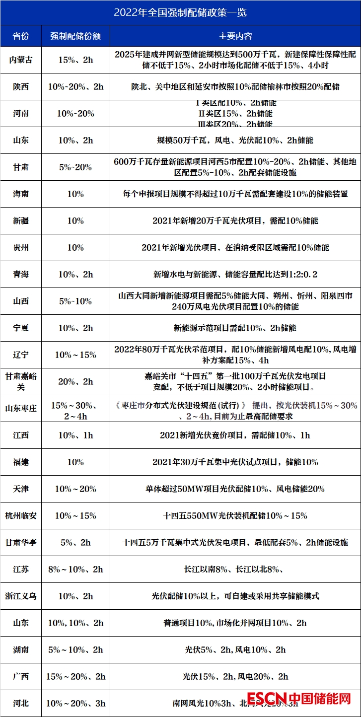 中國儲能網(wǎng)訊:根據(jù)各省下發(fā)的保障性并網(wǎng)、市場化并網(wǎng)新能源項目申報要求,配儲的最低比例如下表。實際上,在大多數(shù)省份,項目要想獲得規(guī)模指標(biāo),實際的配儲比例均高于下表。