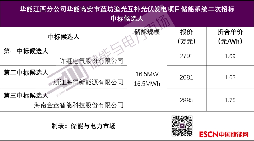 許繼電氣股份有限公司總報價2791萬元,折合單價1.69元/Wh,成為第一中標(biāo)候選人。