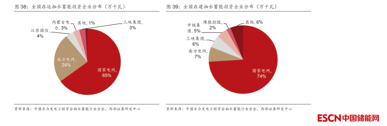 3)下游投資運(yùn)營(yíng):主要企業(yè)有國(guó)網(wǎng)新源、南網(wǎng)雙調(diào),國(guó)網(wǎng)新源占據(jù)領(lǐng)先地位。截至 2021年底,國(guó)網(wǎng)新源公司在運(yùn)和在建抽水蓄能規(guī)模分別為2351、4578萬(wàn)kW,占比分別約64.6%和74.4%,在抽水蓄能開(kāi)發(fā)建設(shè)及運(yùn)營(yíng)市場(chǎng)中占據(jù)絕對(duì)領(lǐng)導(dǎo)地位。中國(guó)抽水蓄能的建設(shè)企業(yè)主要有中國(guó)電建、中國(guó)能建所屬工程局。此外,中國(guó)安能、中國(guó)鐵建等企業(yè)也參與抽水蓄能電站部分地下工程建設(shè)。
