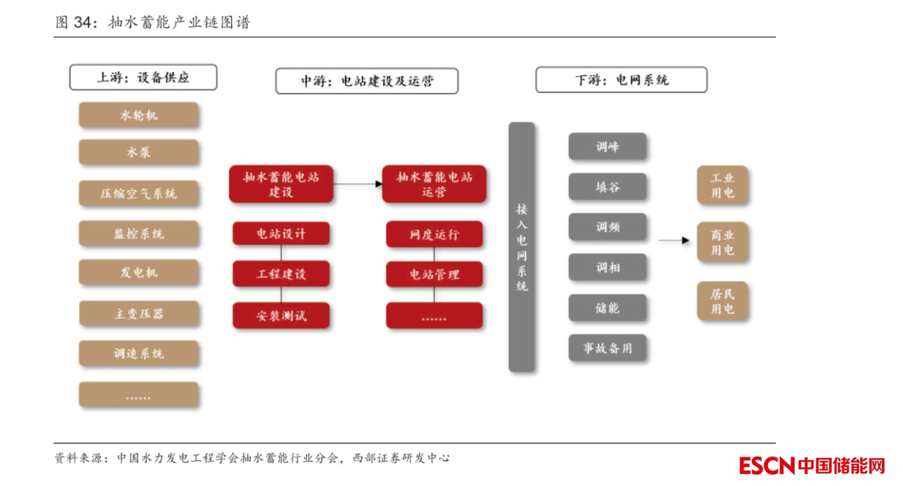 基本形成全產(chǎn)業(yè)鏈發(fā)展體系和專(zhuān)業(yè)化發(fā)展模式。通過(guò)大型抽水蓄能電站建設(shè)實(shí)踐,基本形成涵蓋標(biāo)準(zhǔn)制定、規(guī)劃設(shè)計(jì)、工程建設(shè)、裝備制造、運(yùn)營(yíng)維護(hù)的全產(chǎn)業(yè)鏈發(fā)展體系和專(zhuān)業(yè)化發(fā)展模式。上游主要為設(shè)備供應(yīng),包括水輪機(jī)、水泵、壓縮空氣系統(tǒng)、監(jiān)控系統(tǒng)、發(fā)電機(jī)、主變壓器、調(diào)速系統(tǒng)等;中游主要為建設(shè)工程,包括電站建設(shè)與電站運(yùn)營(yíng)兩個(gè)部分;下游主要服務(wù)于工業(yè)、商業(yè)以及居民用電,主要起到調(diào)峰、填谷、調(diào)頻、調(diào)相、儲(chǔ)能、事故備用等功能。