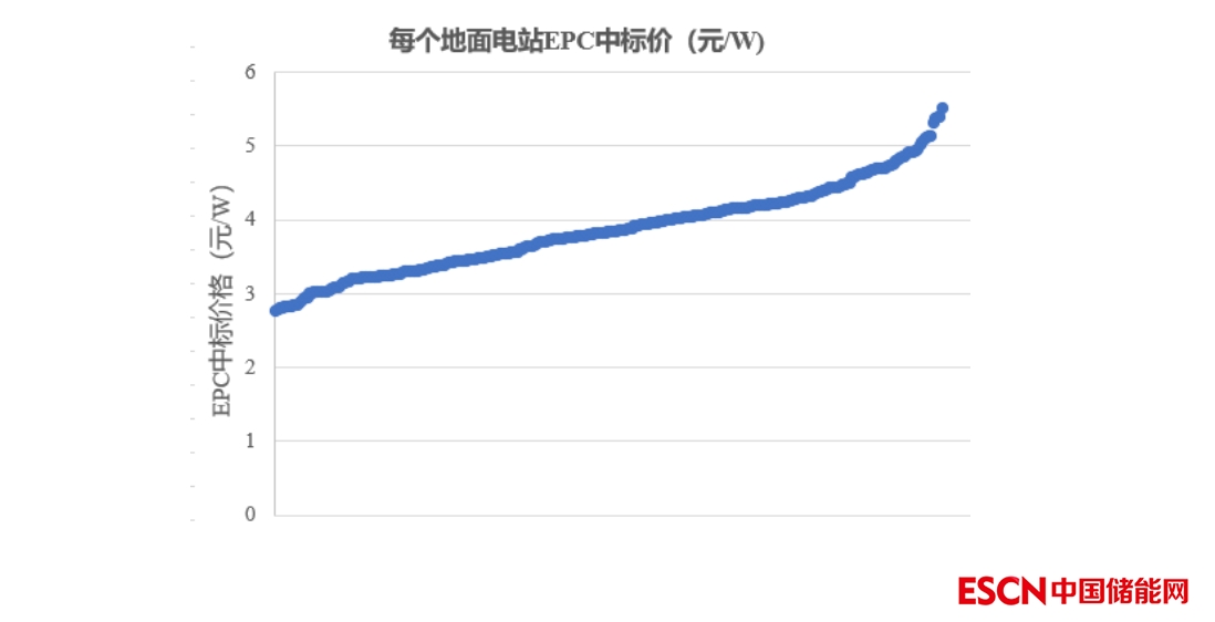 2022年1~12月,共追蹤了57.8GW大型地面光伏電站項(xiàng)目的EPC中標(biāo)價(jià)格,為2.8~5.5元/W之間,加權(quán)平均價(jià)格為3.791元/W。如下圖所示,圖中共有342個(gè)點(diǎn),每個(gè)點(diǎn)代表1個(gè)光伏電站的中標(biāo)價(jià)格。